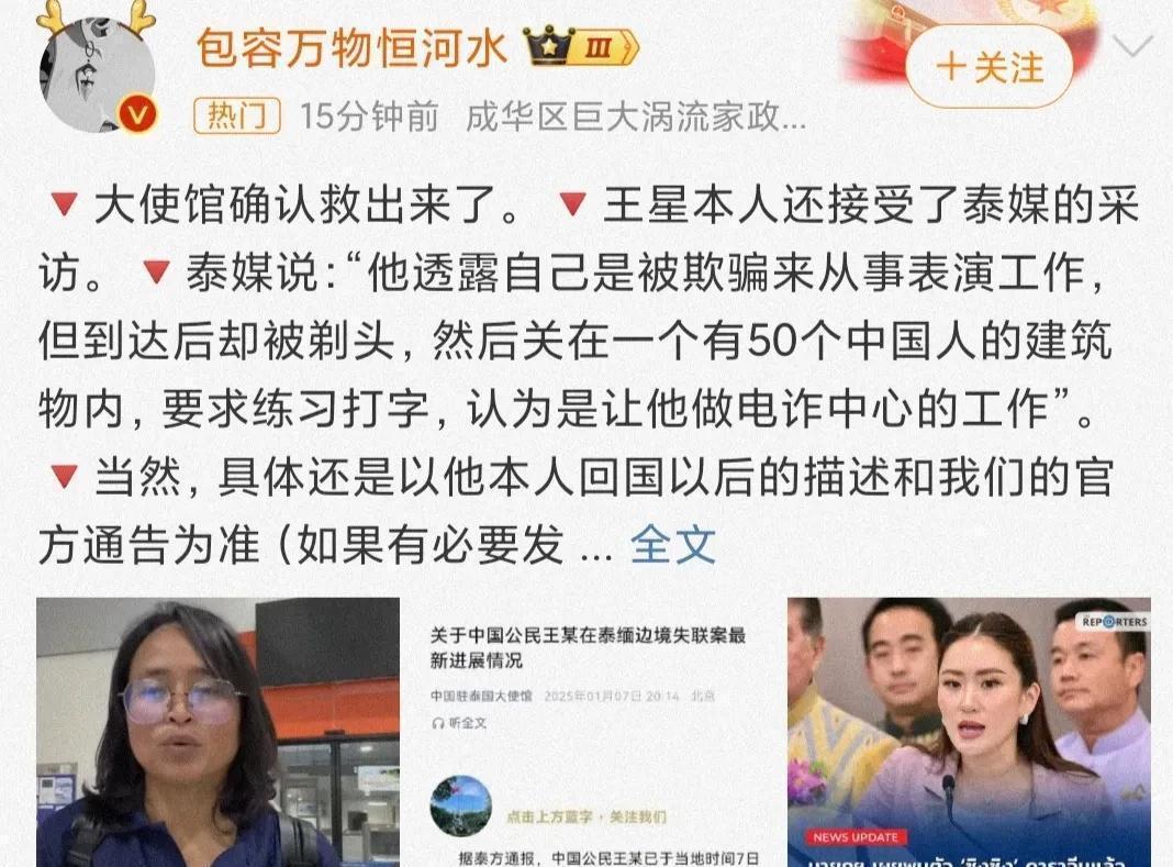 此外,网上说泰媒报说念,王星透露被哄骗来演戏,效果被剃了头发,关在一个建立物内,还要训练打字,认为要作念电诈的责任,诚然,是否属实不知所以,照旧应该以当事东说念主的阐述为准。